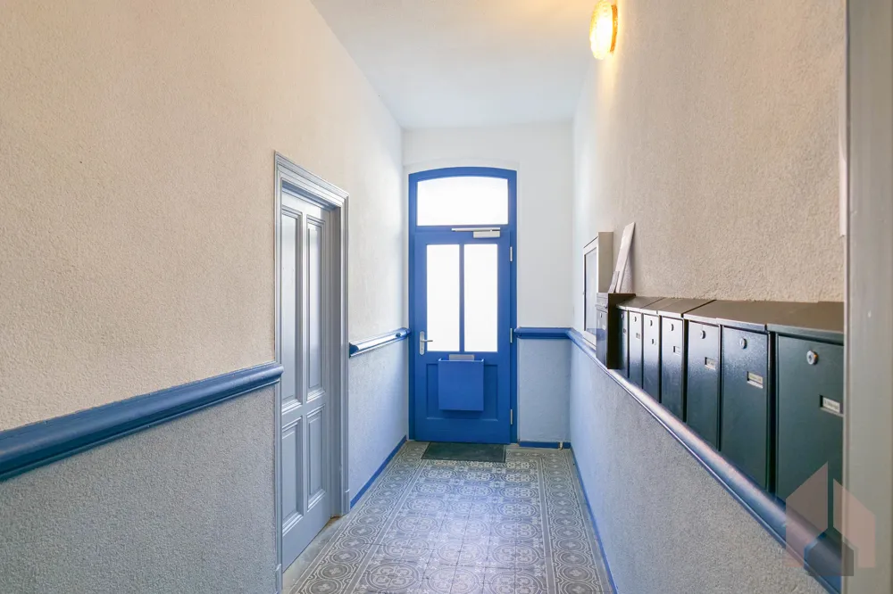 Bereits beim Betreten des Hauses fällt direkt der wunderschöne, grauweiße Original-Ornamentfliesenboden ins Auge. Dieser ist im gesamten Flurbereich im Erdgeschoss verlegt. Darüber hinaus zieren u.a. große und stilvolle Türelemente mit Glaseinsätzen die Wohnungseingänge.
