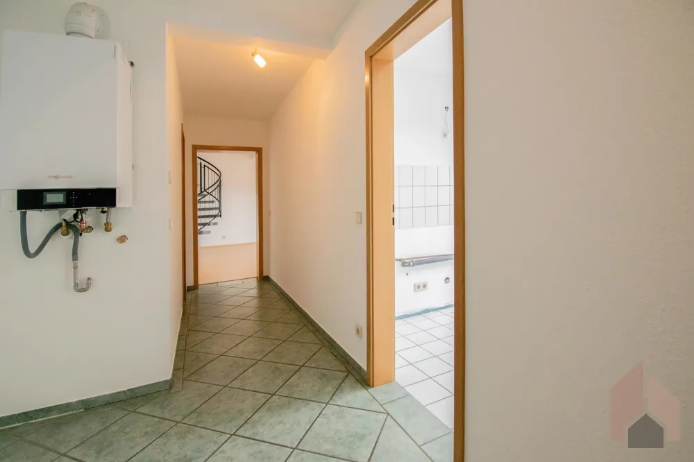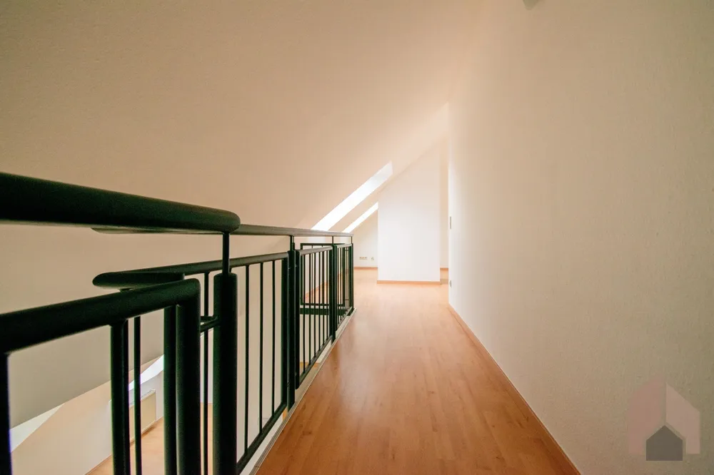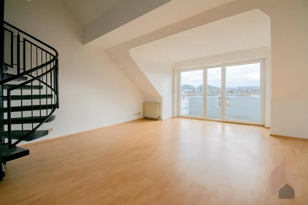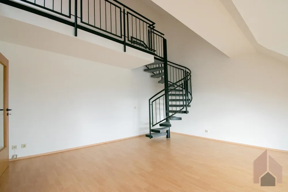 Das Herzstück der Wohnung ist der lichtdurchflutete Wohnbereich mit Zugang zum zweiten Balkon, der Ihnen herrliche Stunden an der frischen Luft ermöglicht. Eine Wendeltreppe führt von hier aus auf die offene Galerie – ein vielseitig nutzbarer Raum, der sich perfekt als Arbeits- oder Loungebereich eignet. Von der Galerie aus gelangen Sie in einen großzügigen Abstellraum, der Ihnen zusätzlichen Stauraum bietet.