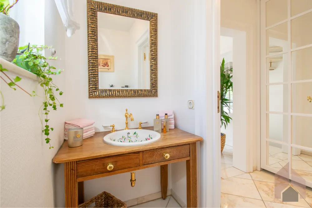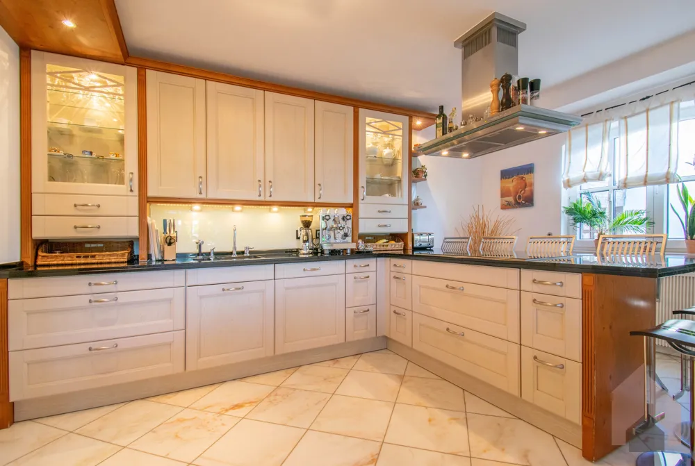 Die Küche ist stimmig im Landhausstil designt. Hier finden Sie alles, was Ihr Herz höherschlagen lässt: ein großes Induktions-Kochfeld, hochwertige Küchengeräte und ausreichend Stauraum. Schwingen Sie den Kochlöffel oder lassen Sie sich hier von Ihren Liebsten bekochen, währenddessen Sie von der angrenzenden Esstheke aus zuschauen.