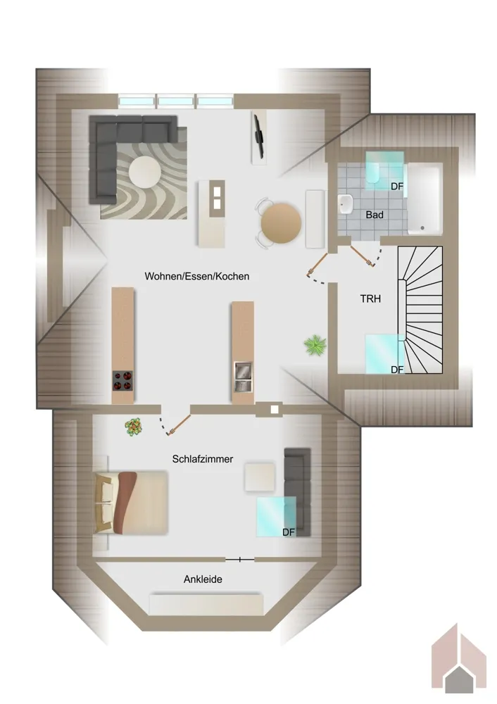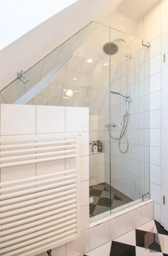 Hier befindet sich ein ca. 34 m² großer Wohnbereich mit offener Küche und angrenzendem Schlafzimmer inkl. begehbarem Kleiderschrank. Abgerundet wird das Dachgeschoss mit einem zusätzlichen Bad mit Dusche.