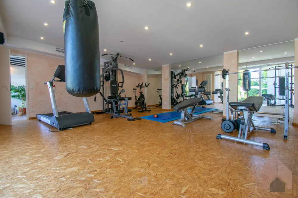 Hinter bodentiefen Schiebetüren befindet sich nicht nur ein Fitnessraum mit Spiegelwand und ausreichend Platz für viele Sportgeräte, sondern auch ein angrenzender Wellnessbereich mit Sauna und Dusche.