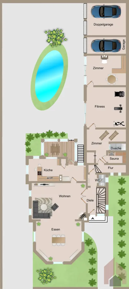 Die unvergesslichen Abende mit Freunden und Familie feiern Sie in Ihrem eigenen Partyraum. Eine eingebaute Theke, ein offener Kamin und Zugang zum Gartenbereich schaffen den optimalen Ort für ausgedehnte Feiern oder gemütliche Spieleabende.