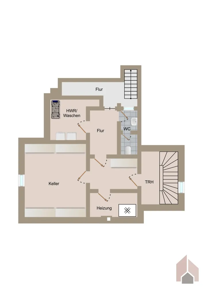 Das Objekt ist größtenteils unterkellert. Im Kellergeschoss finden Sie Versorgungsräume, Heizung, eine Waschküche, Abstellräume und ein weiteres Gäste-WC. Auch aus dem Keller gelangen Sie über einen Ausgang in den Garten.