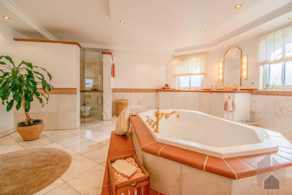 Vom ca. 35m2 großen Hauptschlafzimmer gehen Sie unmittelbar in das sehr großzügige Badezimmer. Diese Wellness-Oase lässt keine Wünsche offen, schauen Sie es sich an….