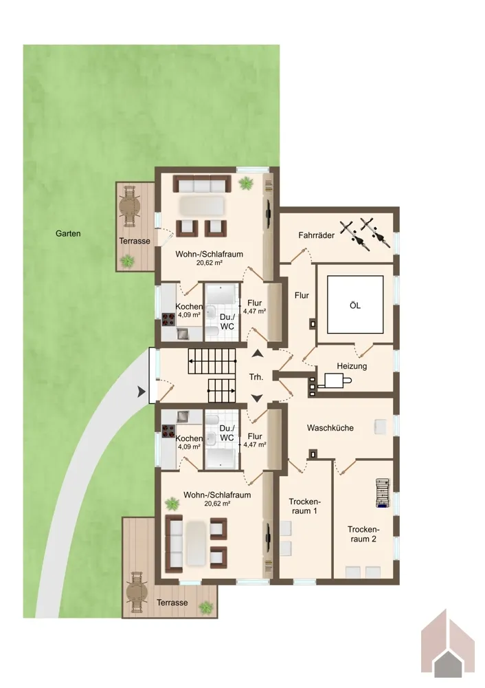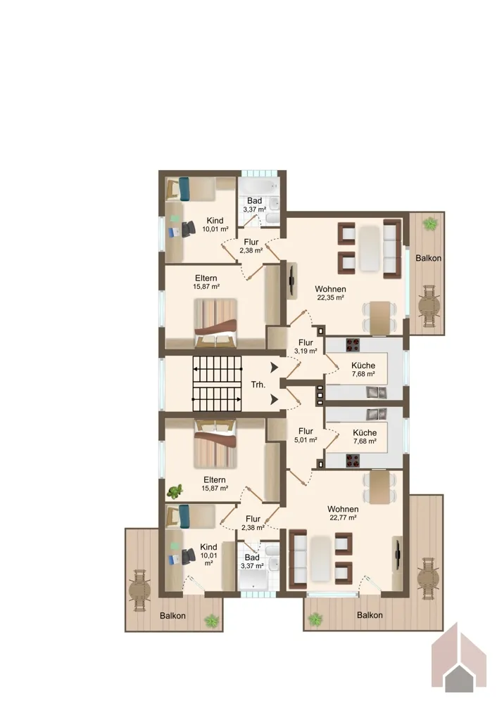 Die gepflegte Immobilie ist aufgeteilt in 4 kleinere Apartments und 4 größere Wohnungen; sowie großflächige, gemeinschaftliche Nutzfläche, wie. z.B. Wasch- und Trockenraum, Fahrradkeller, etc. Ebenso gehört zu jeder Wohneinheit ein eigenes Kellerabteil. Alle Einheiten verfügen über mindestens einen großen Balkon/Terrasse.