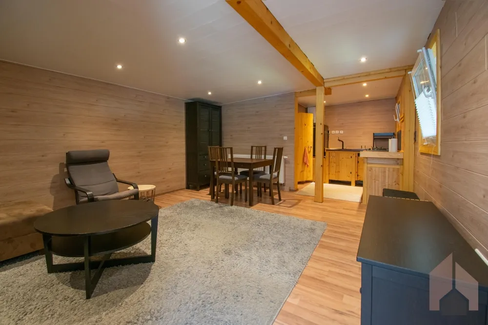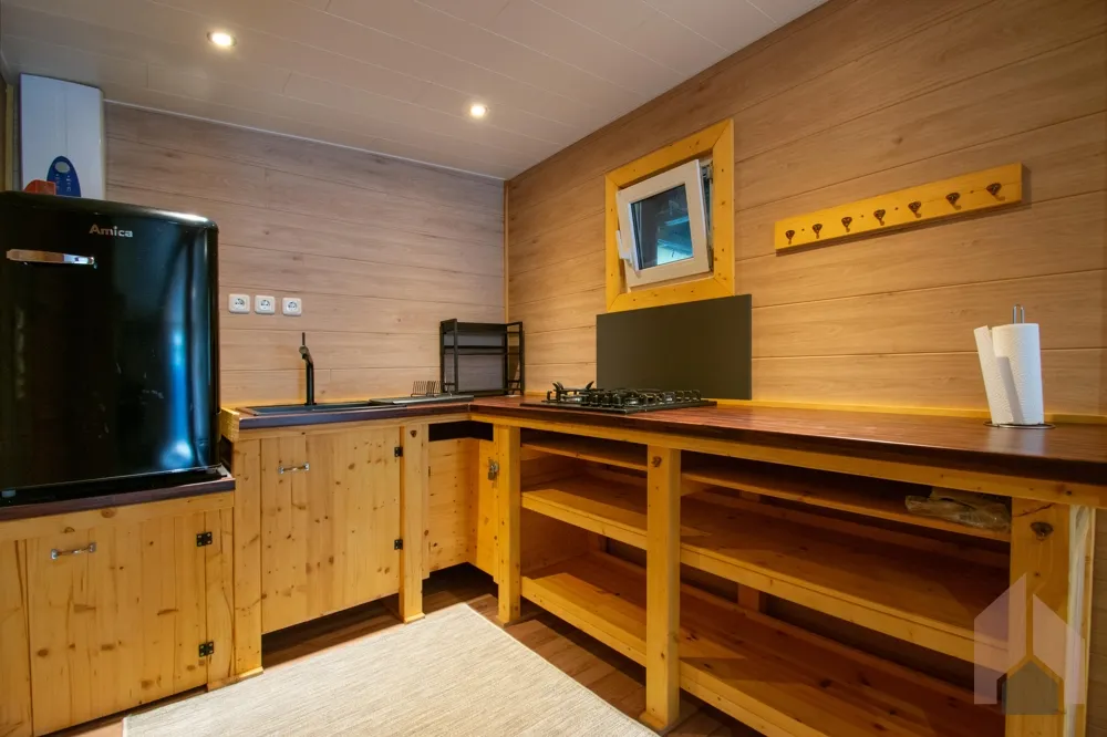 Der Wohnbereich verfügt über eine kleine, selbstgebaute Küchenzeile mit Gasherd (betrieben über eine kleine Gasflasche) und ein kompaktes Duschbad. Das Warmwasser wird über einen Durchlauferhitzer bereitgestellt. Das Dach wurde 2020 erneuert, die komplette Dämmung und Elektrik bereits 2019 – so genießen Sie hier zeitgemäßen Komfort. Die großzügige, einladende Terrasse wurde 2025 vollständig erneuert und lädt zu entspannten Stunden im Freien ein.