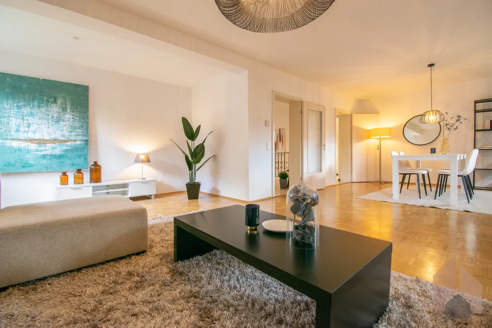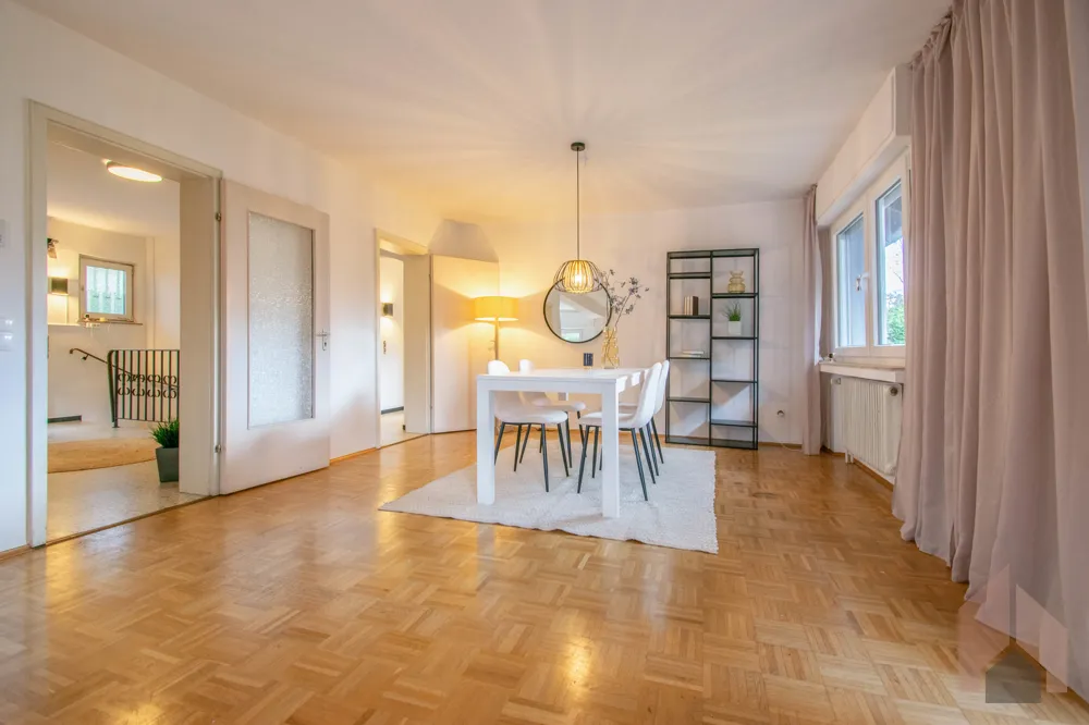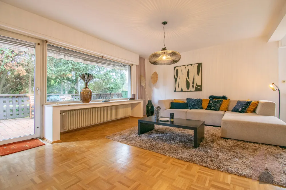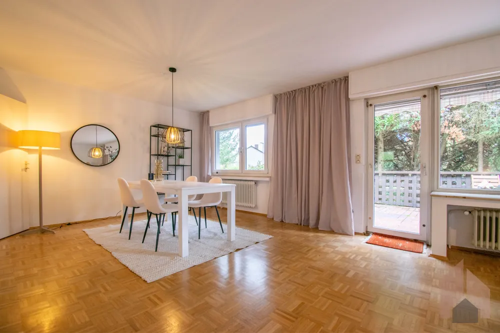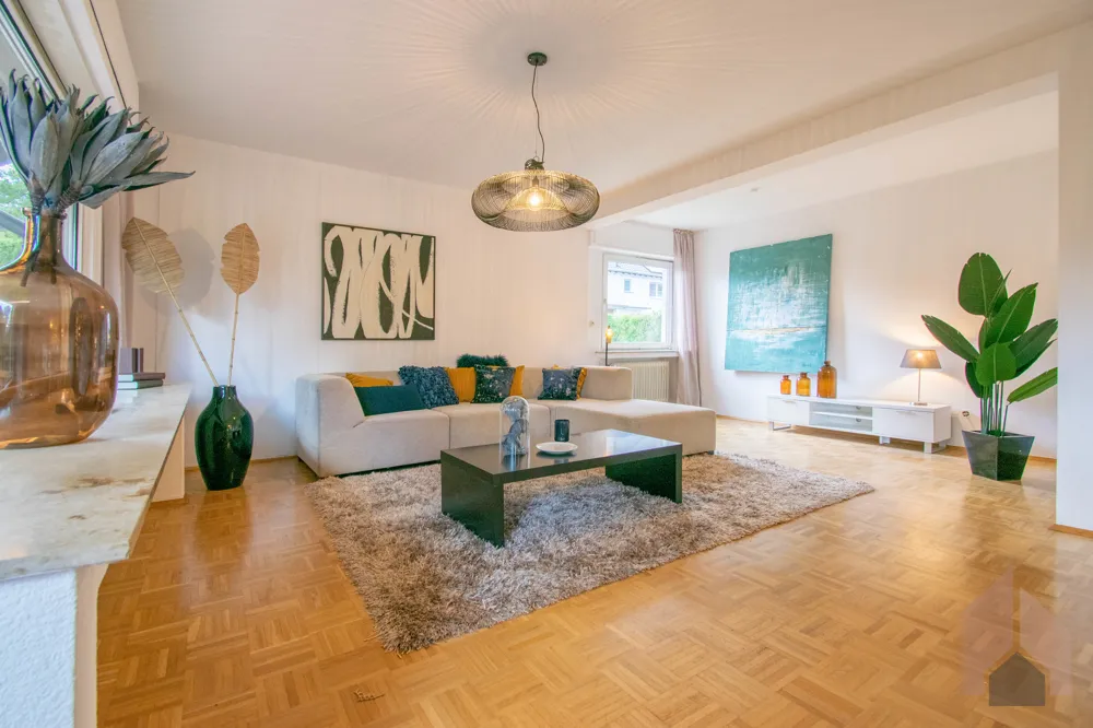 – ein großzügiger, ca. 41 m² großer Wohn-Essbereich mit gepflegtem Parkett