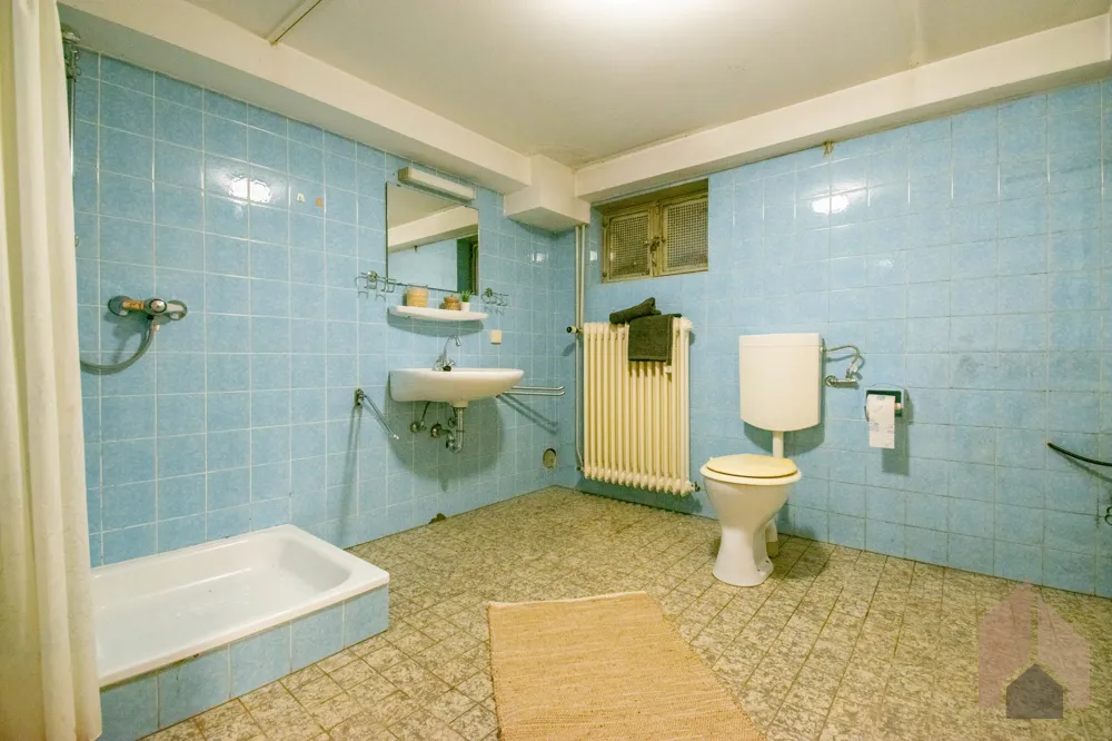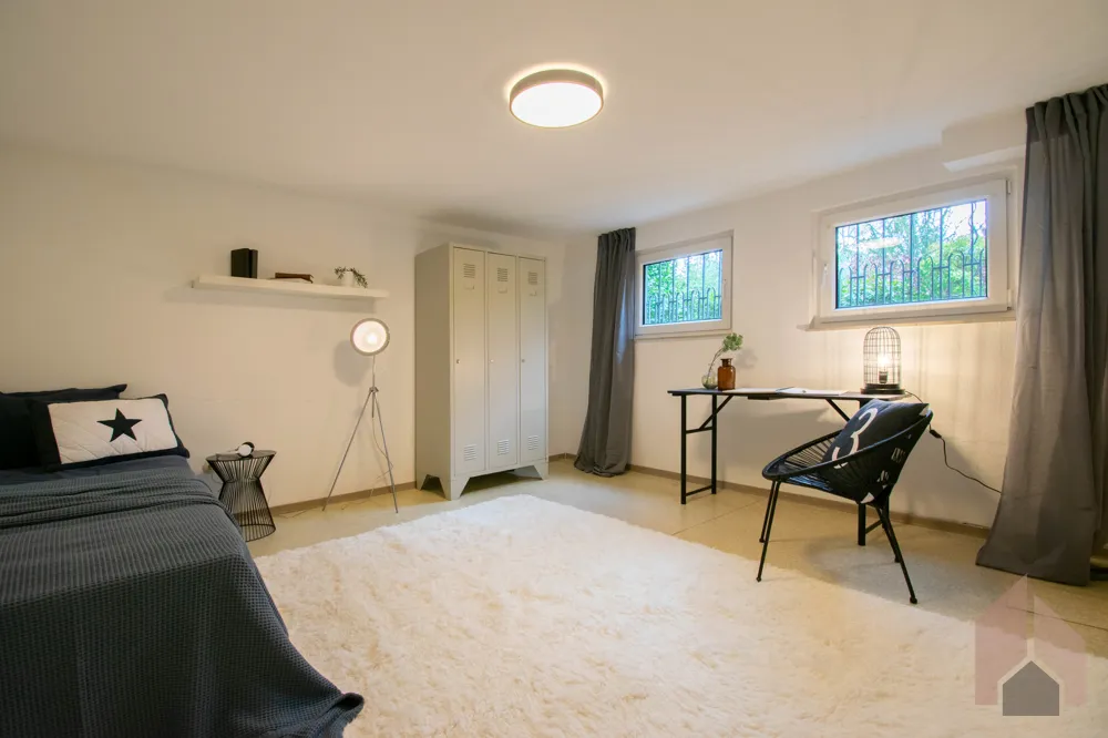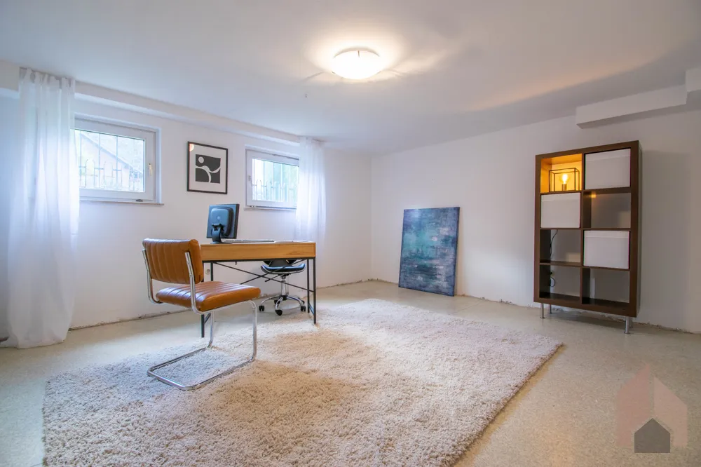 Über die Treppe im Eingangsbereich gelangen wir ins Untergeschoss. Dort bieten Ihnen zwei ca. 16 m² und ca. 17 m² große Räume mit PVC-Böden z.B. die Möglichkeit, ein Büro oder einen Hobbyraum zu schaffen. Alternativ können Sie diese Räume auch für weitere Kinderzimmer nutzen. Ein zusätzliches großes Bad mit Dusche sorgt für kurze Wege. Zum Untergeschoss gehören auch der Heizungsraum und ein Vorratsraum.