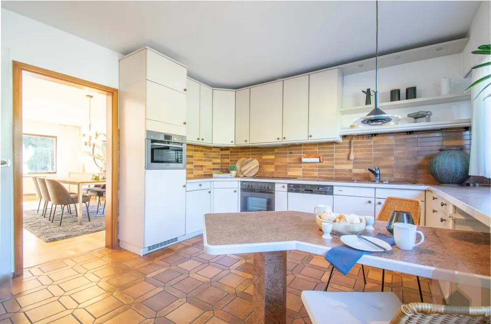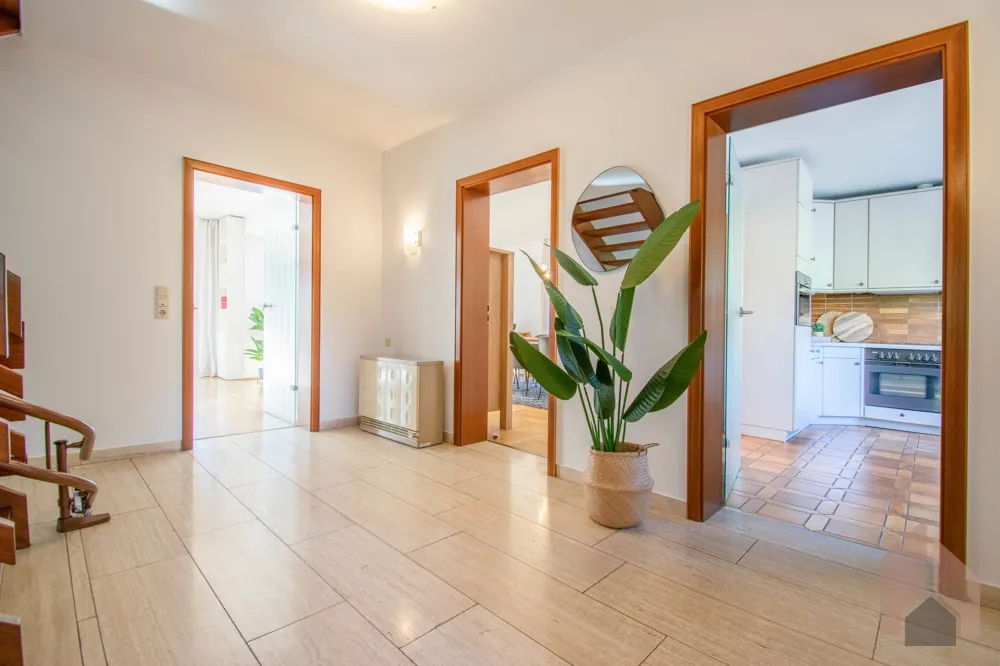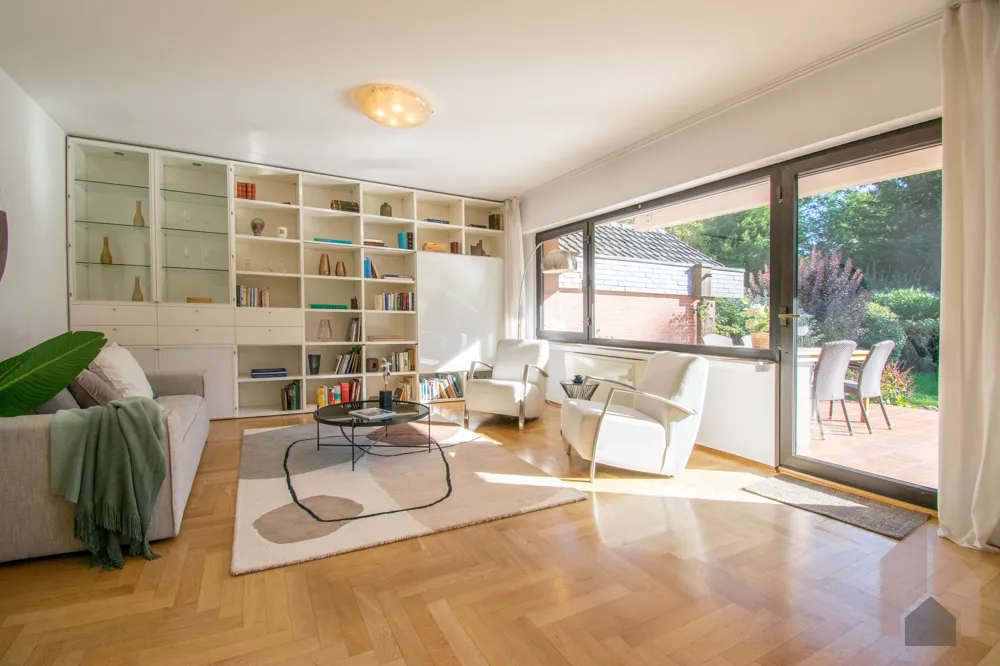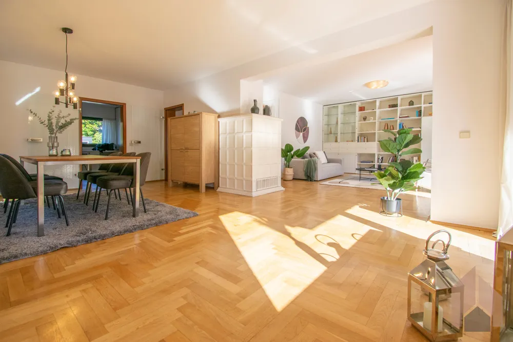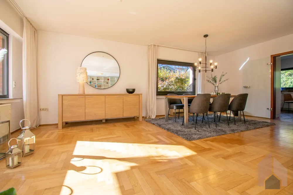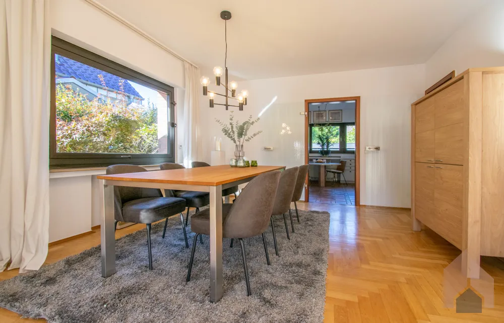 Große Fensterfronten und eine Terrassentür lassen die herbstlichen Sonnenstrahlen ins Haus und bieten einen fantastischen Blick in den gepflegten Garten. Für gemütliche Wintertage sorgt ein Kachelofen, der derzeit optisch den Ess- vom Wohnbereich trennt. Der zeitlose Einbauschrank bietet Ihnen viel Stauraum und vielfältige Dekorationsmöglichkeiten.