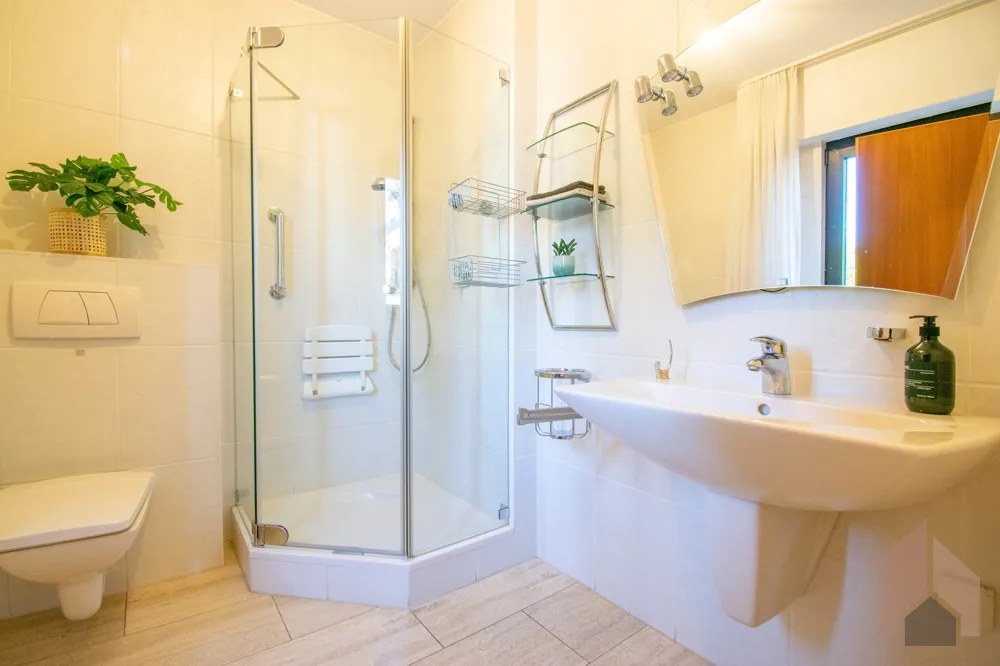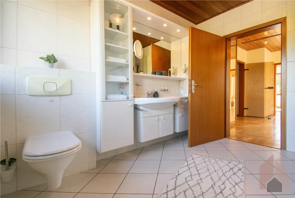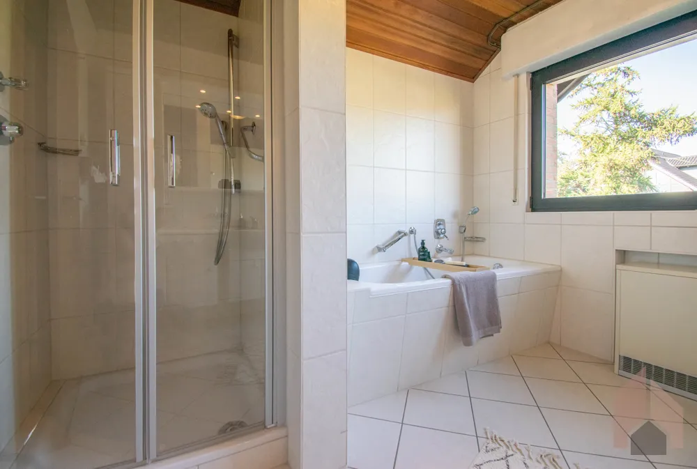 Das Badezimmer ist passend zum Gäste-Badezimmer hell und zeitlos ausgestattet. Auch hier finden Sie ein großes Fenster, welches für Tageslicht und ausreichende Lüftungsmöglichkeit im Nassbereich sorgt. Sind Sie eher der Duschtyp oder nehmen Sie auch mal gerne ein Bad? Dieses Badezimmer wird mit der Einbaudusche und einer zusätzlicher Badewanne Jedem gerecht.