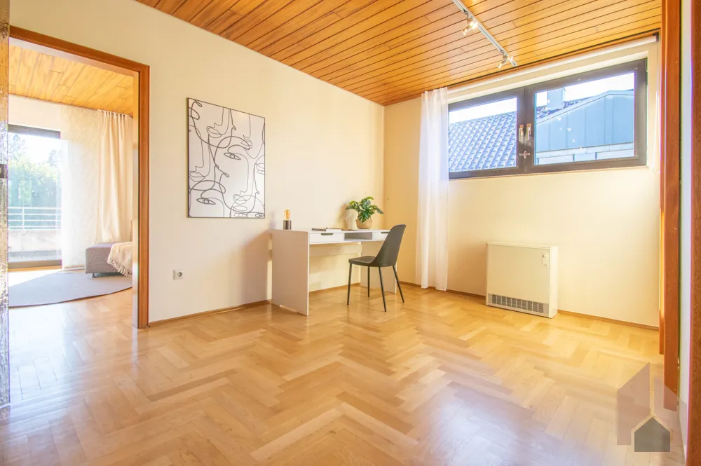 Nebenan befindet sich das derzeitige Ankleidezimmer, welches auch als Büro genutzt werden könnte. Hiervon gehen das Hauptbadezimmer und ein weiteres Schlafzimmer mit angrenzendem Balkon ab.