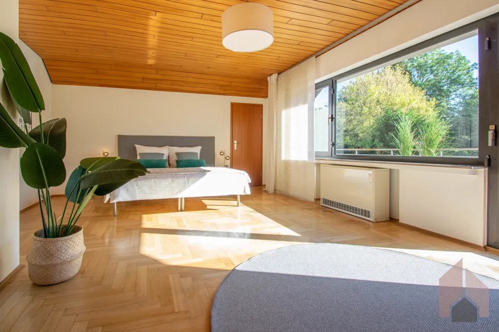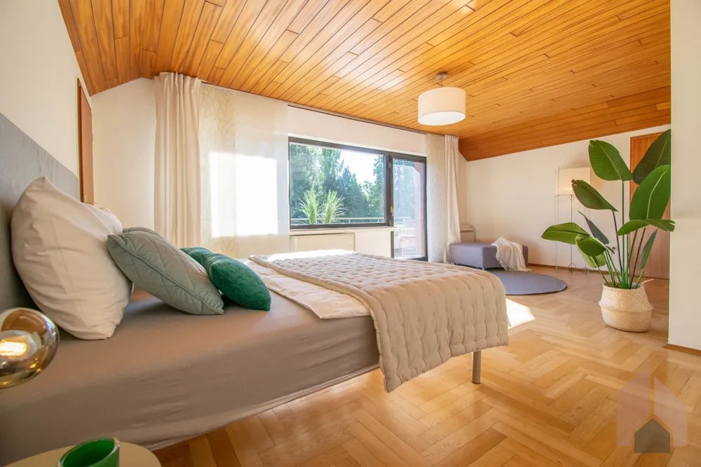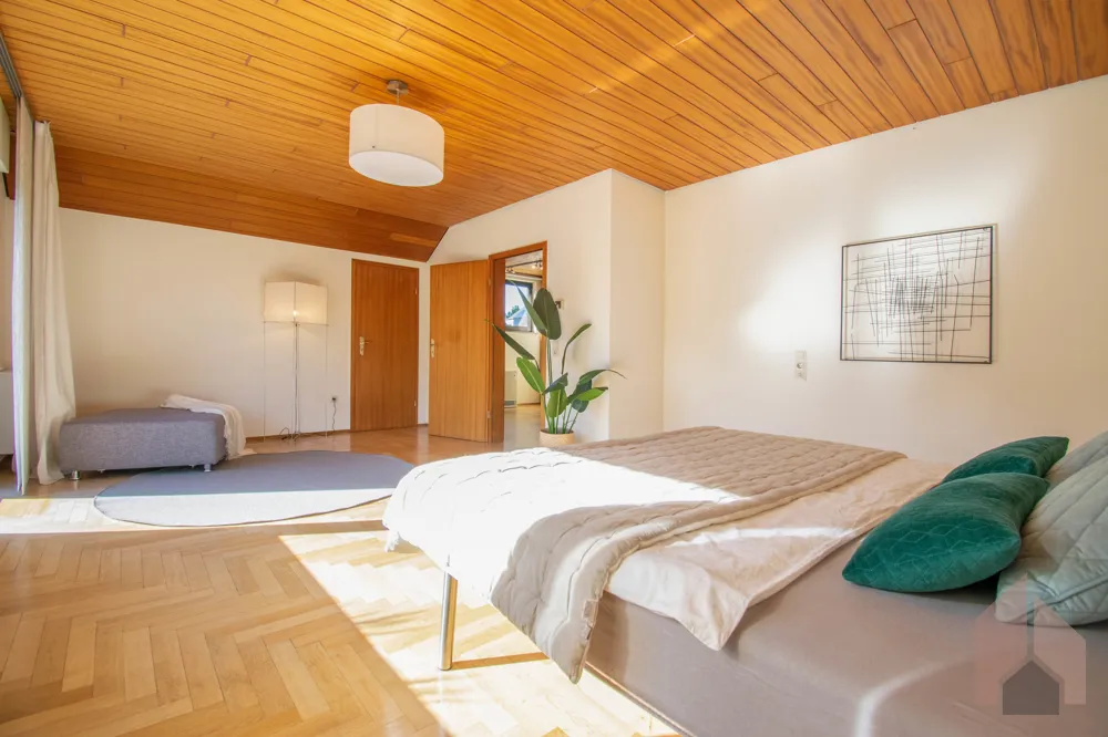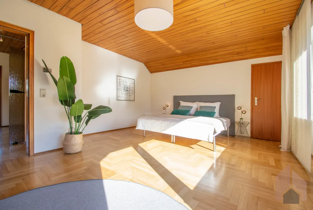 Im Schlafzimmer wurden in den Schrägen jeweils Abstellräume integriert, wodurch Sie zusätzlichen Stauraum zur Verfügung haben. Dadurch haben Sie in dem ca. 32 m² großen Schlafzimmer ausreichend Platz für ein großes Bett.