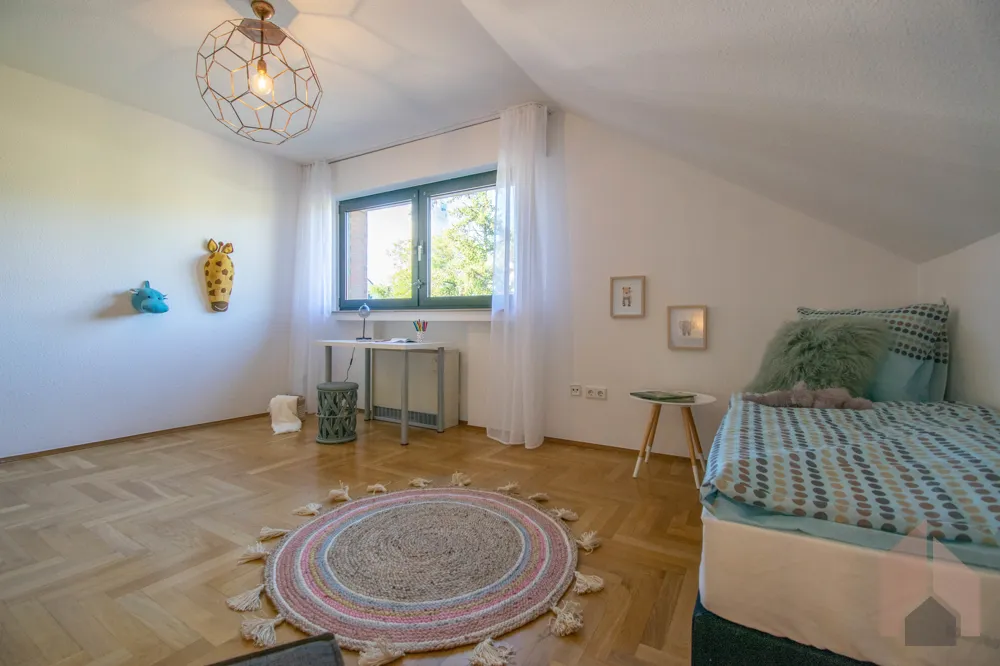 Auf der rechten Seite gelangen Sie in ein Büro- oder Kinderzimmer. Für das Baujahr typisch ist hier ein Waschbeckenbereich integriert. Die einseitige Schräge in dem ca. 15 m² großen Raum sorgt für Gemütlichkeit und eine wohlige Atmosphäre.