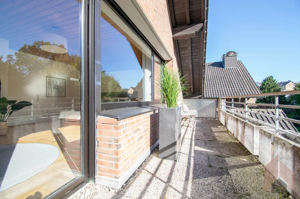 Der angrenzende Balkon ist überdacht und bietet einen wunderschönen Blick über Ihr Grundstück und darüber hinaus in den grünen Park.