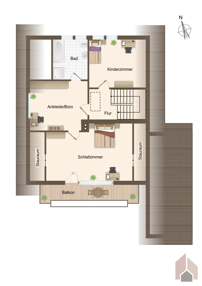 Auch das Obergeschoss hat viel zu bieten. Dieses erreichen Sie über das offene Treppenhaus: