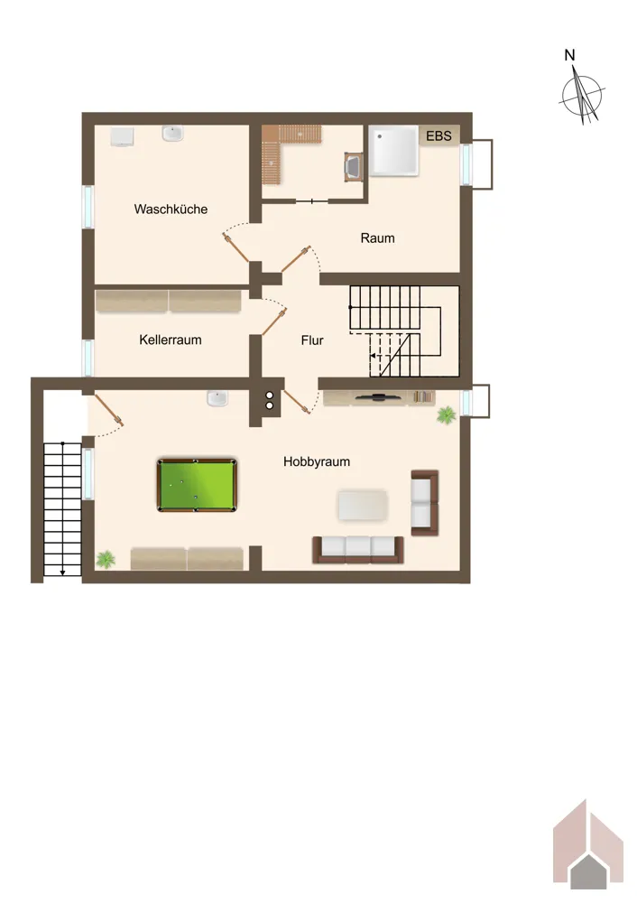 Im Untergeschoss erwarten Sie ein Kellerraum, eine Waschküche, sowie ein Saunabereich mit Dusche und einem großen Hobbyraum mit Zugang zum Garten.