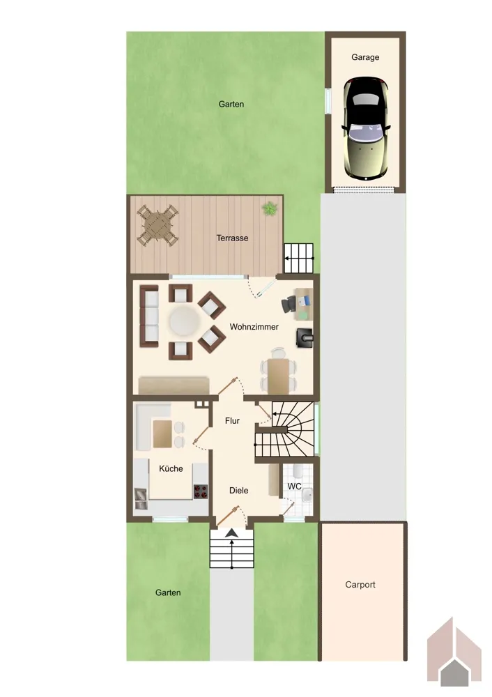 Euer Auto findet in der vorhandenen Garage seinen Platz. Vorgelagert befindet sich ein zusätzliches Carport. Auf Grund der zentralen Lage, könnt ihr aber ruhig euer Auto auch mal stehen lassen und zu Fuß ins Zentrum schlendern…