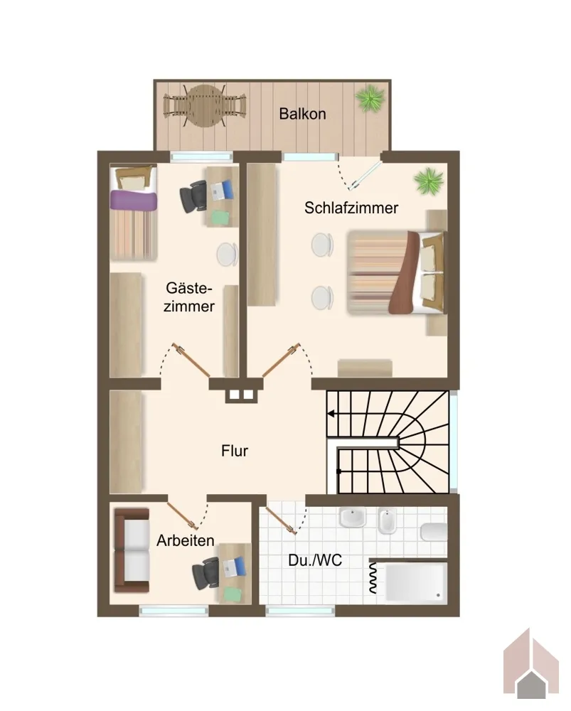 In der ersten Etage erwarten euch drei Zimmer zur freien Gestaltung. Das größte Zimmer bietet sich als Schlafzimmer an, da von hier aus auch der Zugang zum Balkon vorhanden ist.