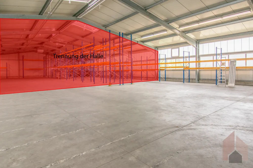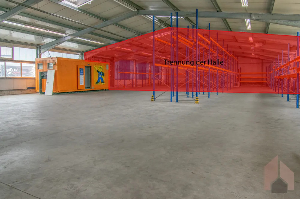 Ein weiterer Pluspunkt: Angeboten wird aktuell eine Teilfläche der Halle, die dank eigenem Rolltor separat und unabhängig genutzt werden kann. Bei Bedarf ist jedoch auch die Anmietung der gesamten Halle möglich – ideal für Unternehmen, die heute flexibel starten und perspektivisch erweitern möchten.