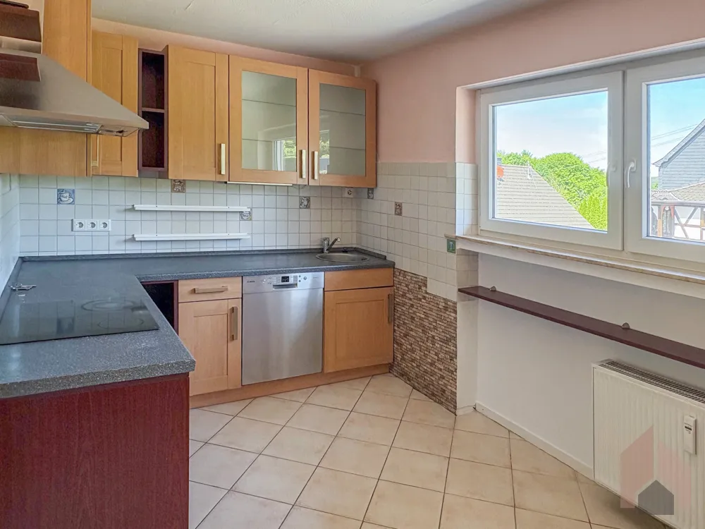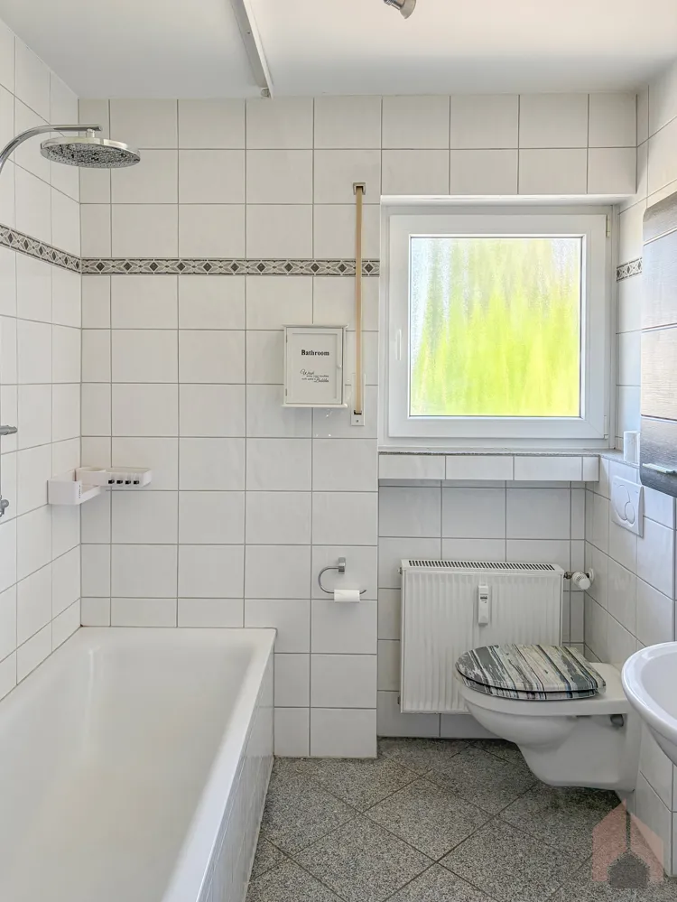Die Küche präsentiert sich angenehm geräumig; die vorhandene Einbauküche kann auf Wunsch übernommen werden. Die Diele bietet ausreichend Platz für Garderobe und zusätzlichen Stauraum und unterstreicht den praktischen Charakter der Wohnung. Sowohl das Badezimmer als auch das separate Gäste-WC sind mit Fenstern ausgestattet und sorgen für eine natürliche Belichtung und gute Belüftung.