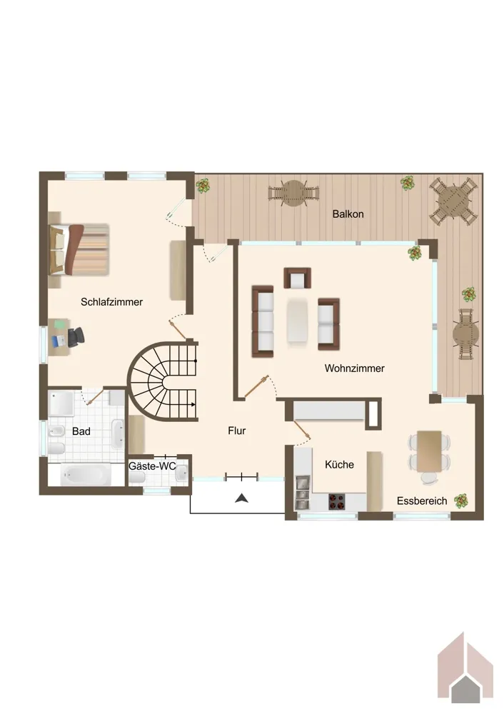 Im Erdgeschoss überzeugt der helle Wohn- und Essbereich mit großen Fensterflächen und dem Blick in den weitläufigen Garten. Die angrenzende Terrasse mit umlaufendem Balkon erweitert den Wohnbereich ins Freie und bietet eine beeindruckende Sicht über das Grundstück. Die separate Küche, ein Gäste WC sowie das große Schlafzimmer mit Bad en Suite und Balkonzugang ermöglichen Wohnen auf einer Ebene.
