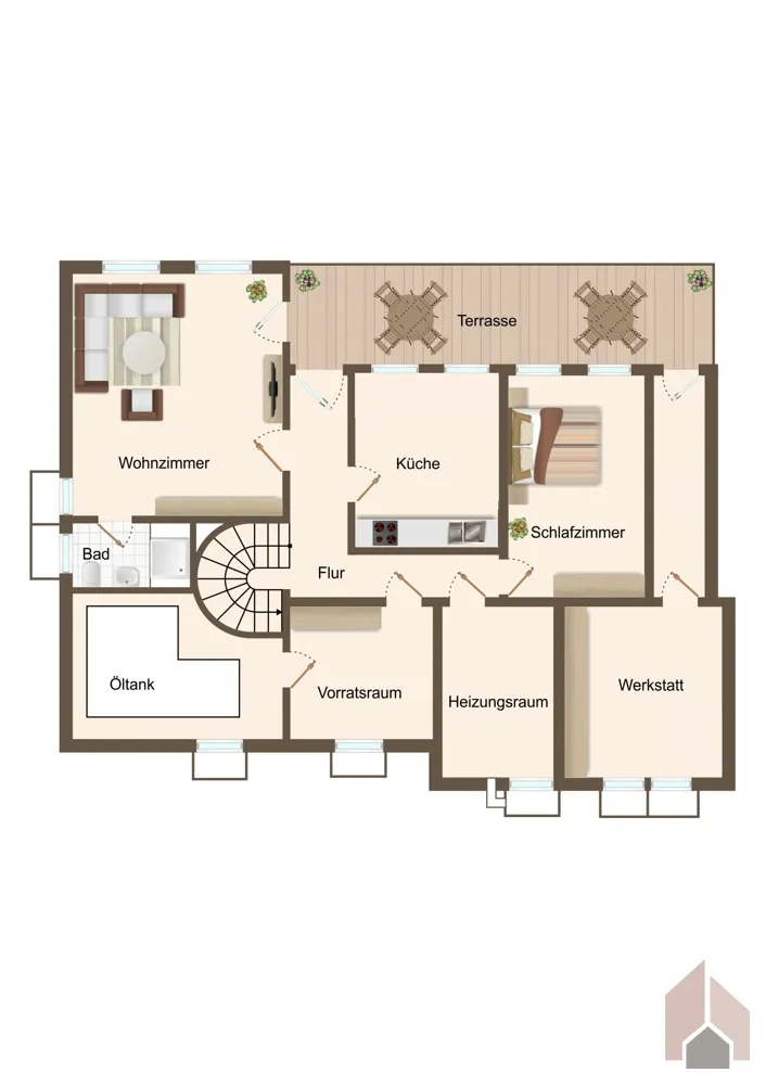 Das Untergeschoss ist durch die leichte Hanglage ebenfalls gut als Wohnbereich nutzbar. Hier befinden sich ein weiteres Wohnzimmer mit Bad, eine abgeschlossene Küche, ein Schlafzimmer sowie mehrere Nutzräume wie Heizungsraum, Öltank, Vorratskeller und eine Werkstatt mit Außenzugang. Von dieser Ebene gelangt man ebenerdig auf eine zweite Terrasse und in den unteren Gartenbereich.