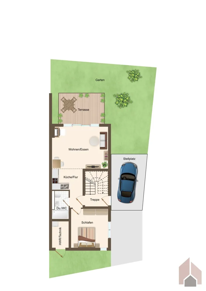 Ihre zukünftige Wohnung wird sich im Erdgeschoss eines Zwei-Parteienhauses befinden.