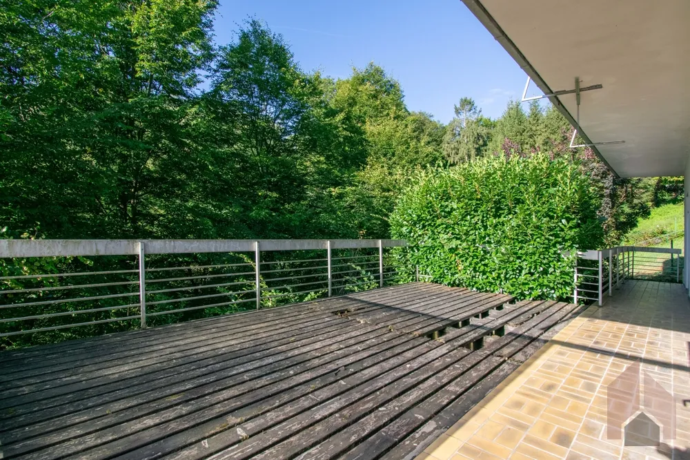 Große Terrassentüren gewähren Zutritt auf die weitläufige Terrasse mitten im Grünen. Durch die umliegenden Bäume liegt die Terrasse absolut privat.