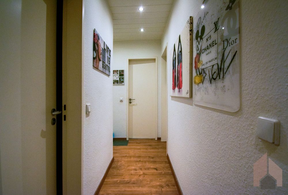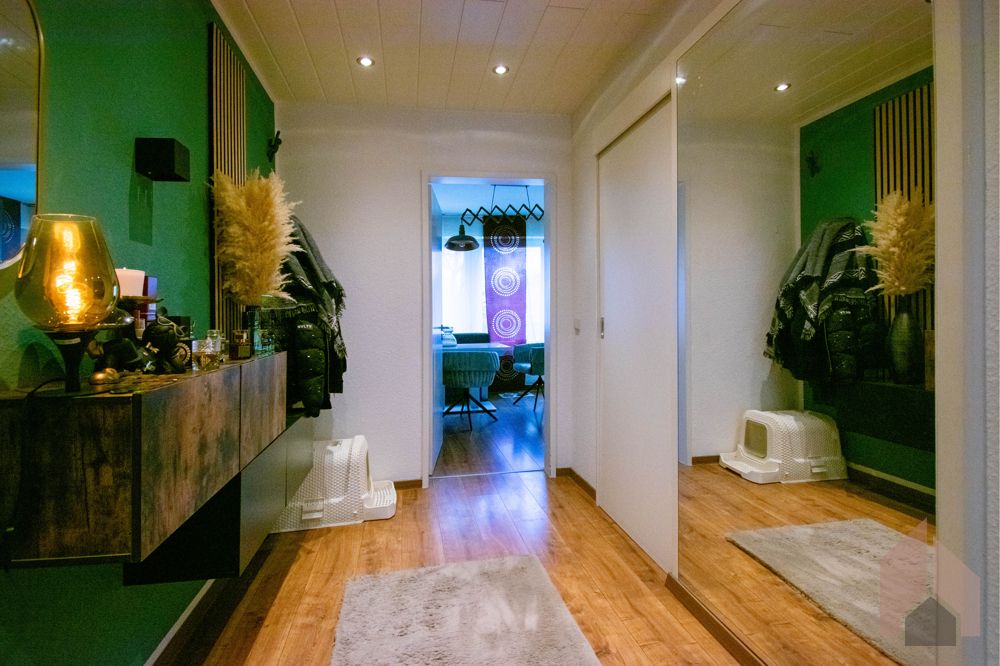 Sie betreten die Wohnung und gelangen in eine geräumige Diele, von der aus alle Räume sinnvoll erreichbar sind. Direkt auf der rechten Seite öffnet sich der helle Wohnbereich mit großen Fensterflächen und dem Zugang zum Balkon. Dieser Bereich bildet den Mittelpunkt der Wohnung und schafft eine angenehme Verbindung zwischen Innenraum und Außenfläche.