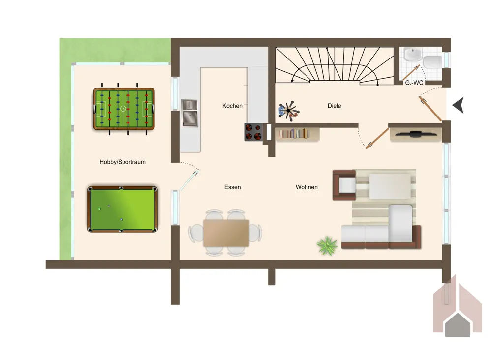Starten wir mit dem Erdgeschoss: Hier befindet sich neben dem Eingangsbereich, welcher den Zugang in die verschiedenen Etagen ermöglicht, auch der Zugang zum offenen Wohn- Essbereich. Ein modernes Gäste-WC mit Fenster ist ebenfalls vorhanden.