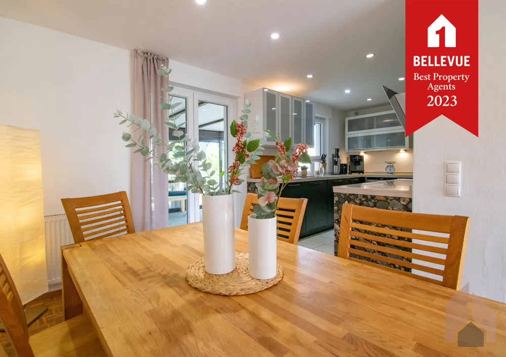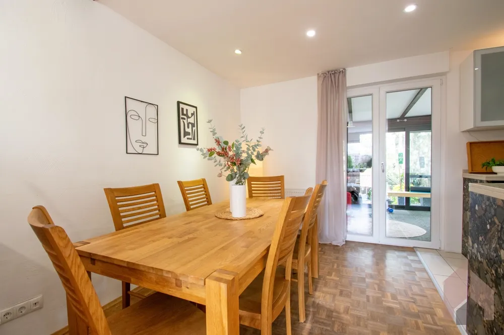Auch für einen Esstisch finden Sie hier Platz. Dieser schafft die optimale Verbindung zu der angrenzenden Küche.