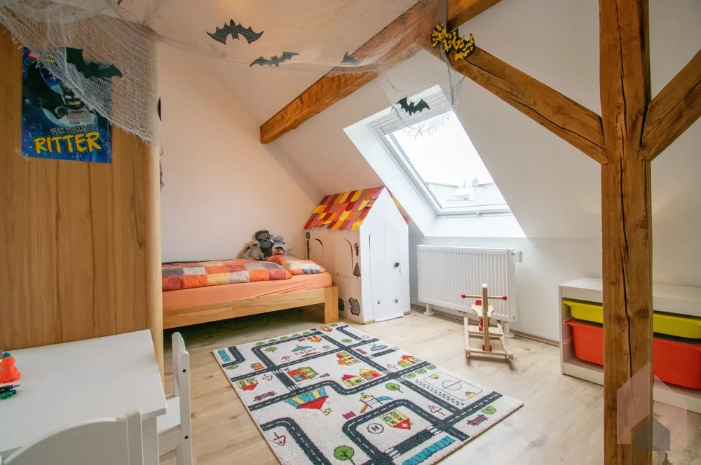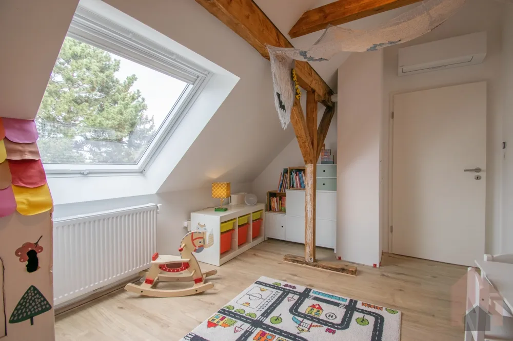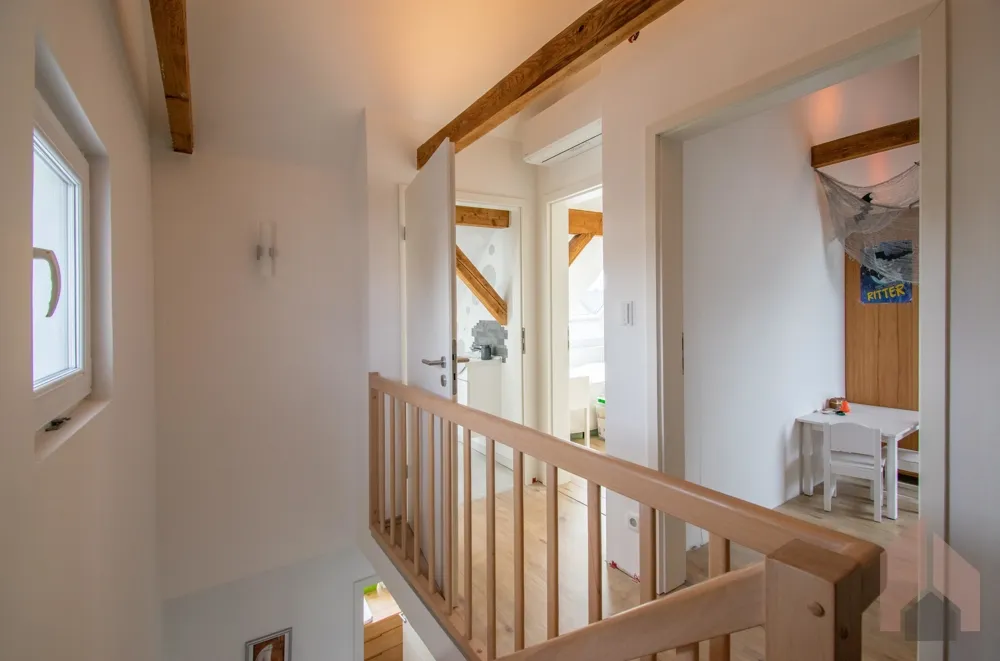 Für besonders viel Charme sorgen die teilweise freigelegten und aufgearbeiteten Dachbalken in Kombination mit den modernen Elementen. Große Dachfenster sorgen für viel Tageslicht.