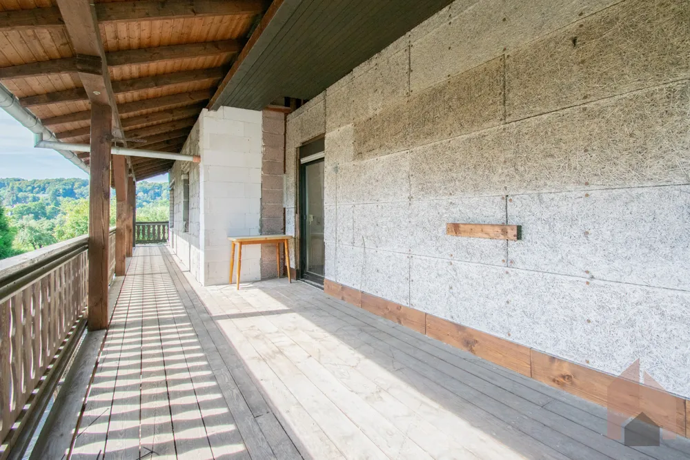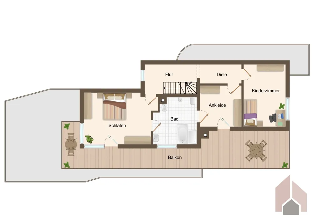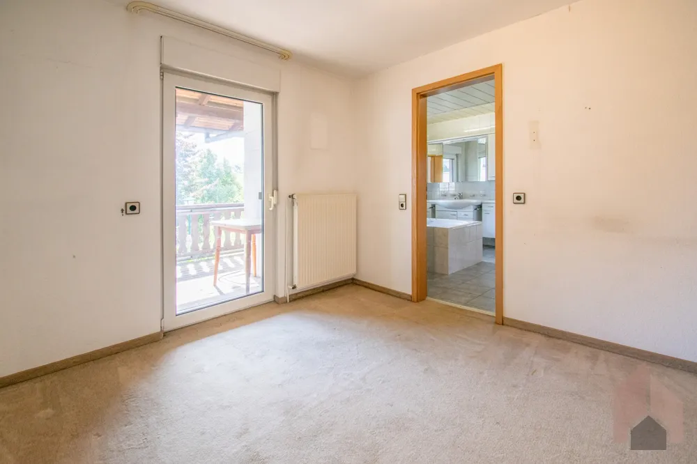 Im Obergeschoss befindet sich das Elternschlafzimmer mit direktem Zugang zum Badezimmer. Angeschlossen sind zudem eine praktische Ankleide sowie ein separates Kinderzimmer. Von Schlafzimmer und Ankleide aus gelangen Sie auf einen großzügigen Balkon, der sich über zwei Seiten des Hauses zieht und einen herrlichen Blick in die Natur sowie über das weitläufige Grundstück bietet.