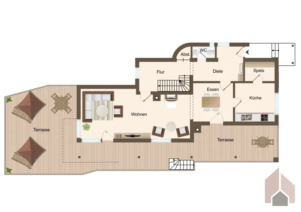 Beim Betreten des Hauses werden Sie im Eingangsbereich empfangen. Rechterhand befinden sich ein Gäste-WC mit Waschbecken, Toilette und Pissoir sowie ein kleiner Abstellraum. Auf der linken Seite öffnet sich der Essbereich, der fließend in das Wohnzimmer mit Kamin übergeht. Eine abgeschlossene Küche mit angrenzender, großer Abstellkammer rundet das Raumangebot auf dieser Ebene ab. Von Ess- und Wohnbereich gelangen Sie auf eine großzügige, nachträglich angebaute Terrasse, die mit etwas handwerklichem Geschick zu einem echten Highlight im Außenbereich werden kann.