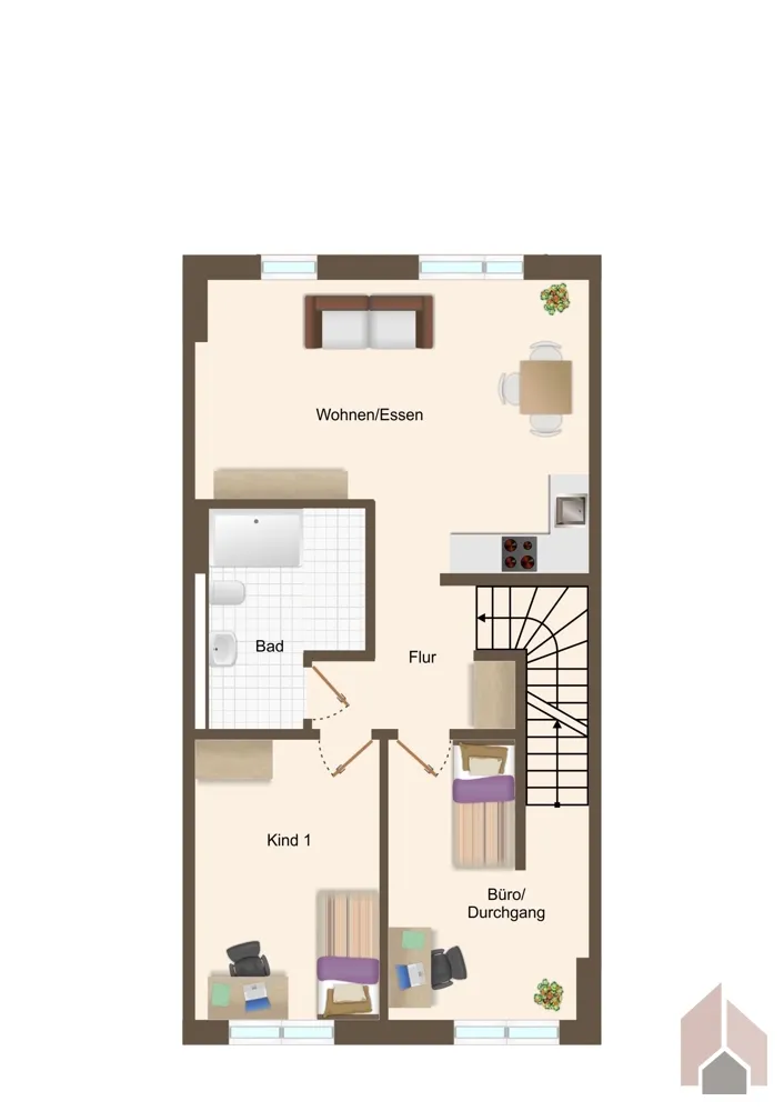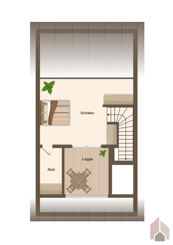 Ihre zukünftige Wohnung wird sich im Obergeschoss eines Zwei-Parteienhauses befinden und über zwei Etagen erstrecken.