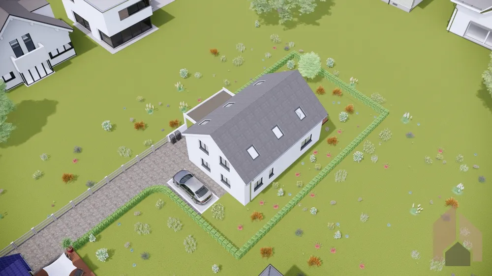 Auch die Gartengestaltung ist bereits mit Einzug fertiggestellt. Die Einfahrt zum Haus wird gepflastert und die Terrasse angelegt sein.