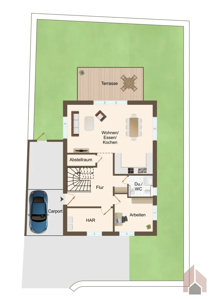 Während Ihre Gäste am gedeckten Tisch Platz nehmen, nehmen Sie, durch die offene Raumgestaltung, weiter an den Gesprächen teil. Praktisch ist der geplante Abstellraum, welcher viel Platz für Vorräte bietet.