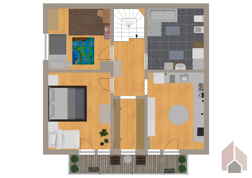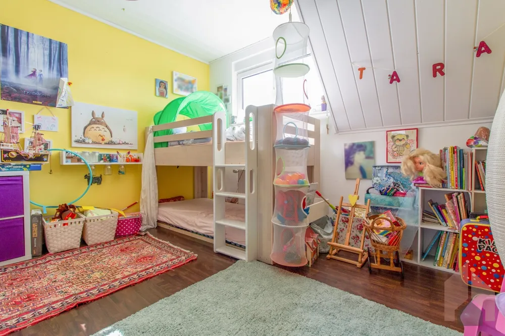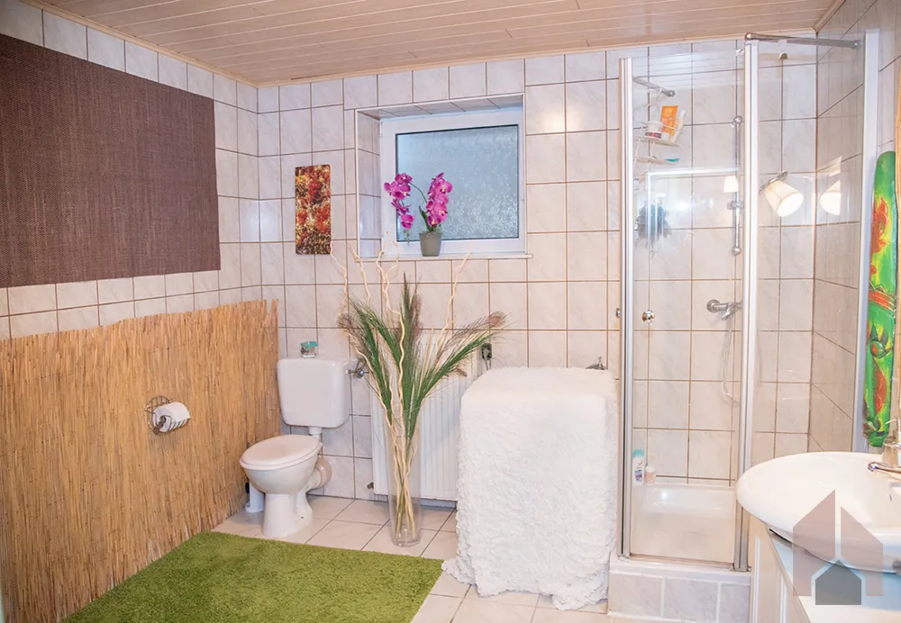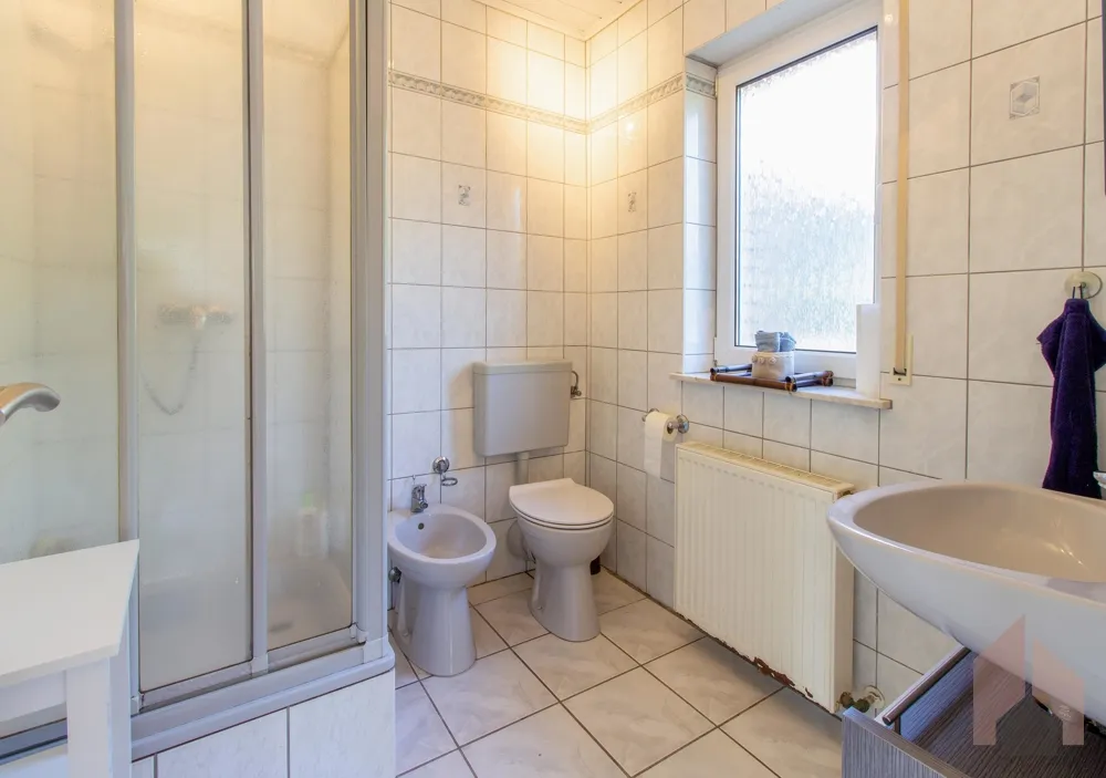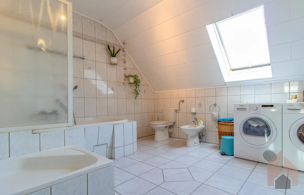 Über eine Treppe gelangen Sie in das Obergeschoß mit großzügigem Badezimmer, welches neben Wanne und Dusche ebenfalls Platz für Waschmaschine und Trockener bereithält. Auf dieser Etage befinden sich ebenfalls drei vollwertige Zimmer, die sich als Kinder-, Gäste- oder Arbeitszimmer gleichermaßen gut eignen.