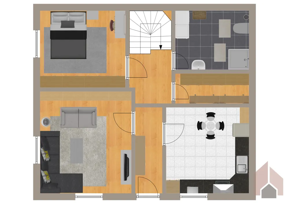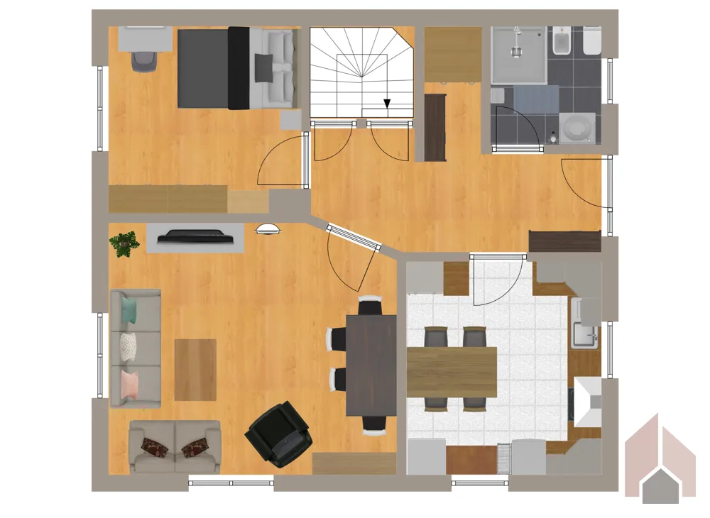 Bereits das Erdgeschoss bietet eine gemütliche Wohnküche mit Platz für die ganze Familie; ein geräumiges, helles Wohnzimmer mit heimeligem Kaminofen, sowie ein weiteres Zimmer, das als Schlaf-, Kinder- oder Arbeitszimmer gleichermaßen gut nutzbar ist. Komplettiert wird die Ebene durch ein Gäste-WC mit Dusche.