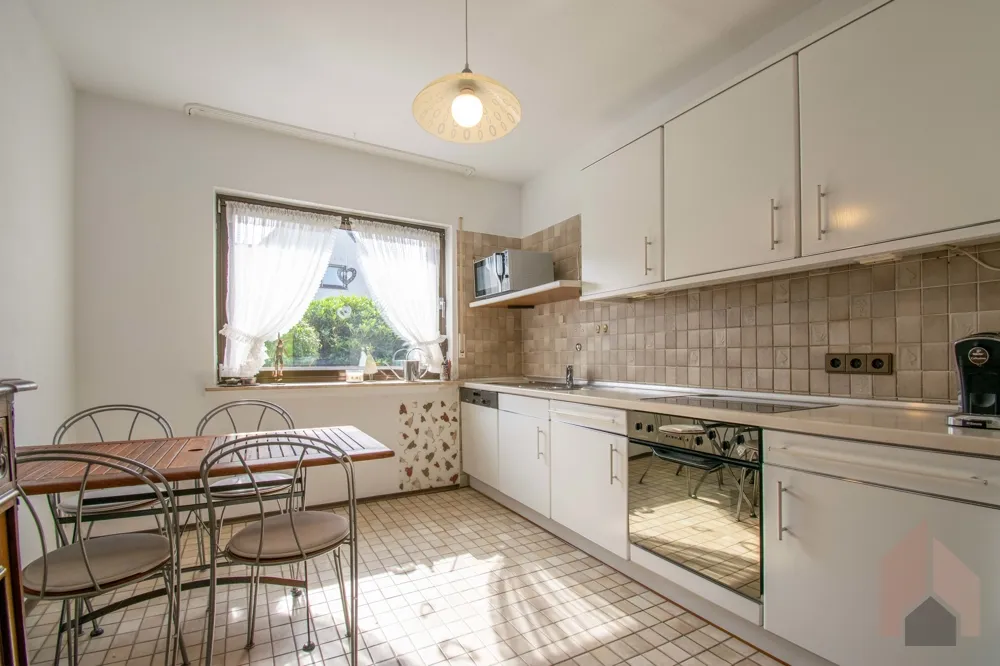 Die abgeschlossene Küche befindet sich gegenüber, auf der anderen Seite der Diele. Angrenzend liegt ein großes Zimmer, das die Möglichkeit zum Einbau einer Küchenzeile bietet. Dieses Zimmer verfügt auch über ein modernes, abgeschlossenes Bad. Optimale Voraussetzungen für einen eigenen Wohnbereich z.B. für ein älteres Kind oder Ihre Gäste.