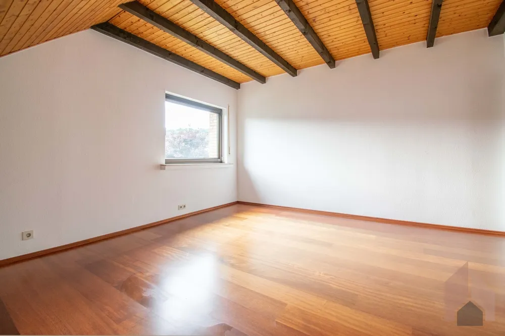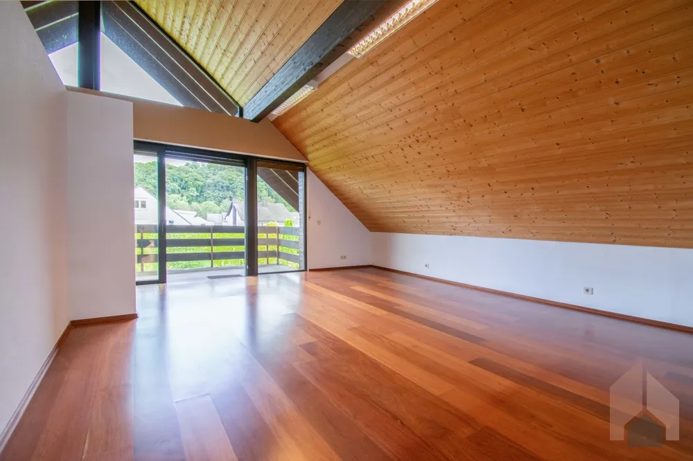 Die Decke ist bis zum Giebel geöffnet und sorgt für eine außergewöhnlich großzügige Atmosphäre. Eine bodentiefe Fensterfront, sowie der Zugang zu einem Balkon, der sich über die gesamte Breite des Hauses erstreckt, runden das Zimmer ab.