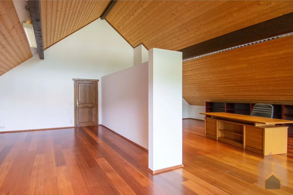 Gegenüberliegend befindet sich ein sehr großer Raum, welcher derzeit durch einen Raumteiler in Leichtbauweise geteilt ist. Die Trennung kann recht unproblematisch wieder rückgängig gemacht werden. Derzeit könnte eine attraktive Kombination aus z.B. einem großzügigen Schlafzimmer und einem Ankleidebereich gestaltet werden. Ideal könnte der Raum auch als Atelier genutzt werden.