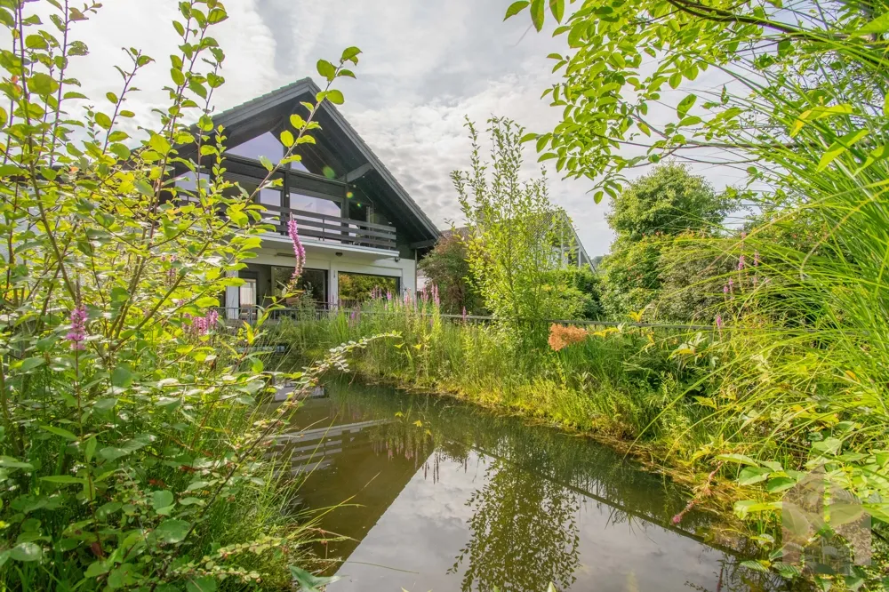 Zentral im Garten gelegen befindet sich ein aktuell als Teich genutztes Schwimmbecken, welches je nach Bedarf wieder als solches umfunktioniert werden kann. Die Zaunelemente herum grenzen das Grundstück ein.