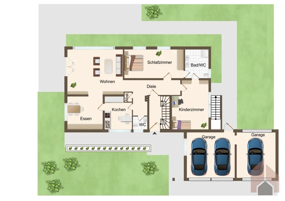 Drei direkt ans Haus angrenzende Garagen bieten zusätzlichen Stauraum und komfortable Parkmöglichkeiten. Der pflegeleicht angelegte Garten lässt Raum für individuelle Gestaltungsideen.